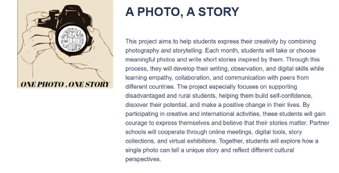 Este proyecto tiene como objetivo ayudar a los estudiantes a expresar su creatividad combinando fotografía y narración. Cada mes, los estudiantes tomarán o elegirán fotos significativas y escribirán relatos cortos inspirados en ellas. A través de este proceso, desarrollarán sus habilidades de escritura, observación y competencias digitales, mientras aprenden empatía, colaboración y comunicación con compañeros de diferentes países.